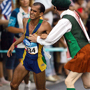 A história é famosa: Vanderlei Cordeiro de Lima, brasileiro, liderava a prova em mais de sua metade, suscitando esperanças de uma medalha de ouro em toda a nação. Aos 36 quilômetros, foi atacado por um lunático religioso que queria aparecer. Vanderlei parou, se desvencilhou, mas perdeu tempo, velocidade, ritmo e, mais importante em uma corrida de longa distância, concentração.