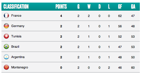 A classificação de fato está embolada, ainda mais após os outros jogos do grupo na segunda rodada. A França é a única que não deve ter dificuldade de se classificar, e segue invicta e líder, com 4 pontos. A Tunísia é a grande surpresa do grupo, impondo dificuldade sobre a França no primeiro jogo (30×27) e vencendo a Alemanha no segundo (25×23).